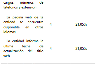 En contraste con lo anterior, las variables que presentan resultados bajos, oscilando entre el 21,05% y el 39.47%, son: la actualización de los sitios web, la disponibilidad de información en idiomas diferentes al nativo y el directorio de sus funcionarios con los datos correspondientes; lo que puede conllevar al usuario a encontrar información que no esté vigente, se limite su consulta por parte de usuarios extranjeros que requieren la información y se evidencie una baja capacidad para comunicarse de manera específica con el funcionario competente para atender los requerimientos de los usuarios, lo que impide una orientación oportuna y el aumento del tiempo de espera en la línea de atención general.