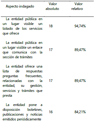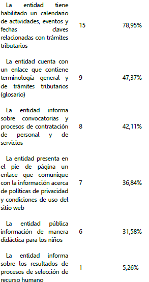 De manera particular, llama la atención los resultados significativos obtenidos en los aspectos que hacen referencia a la lista de los servicios ofrecidos por cada entidad, los trámites correspondientes y la resolución a preguntas frecuentes, son las que presentan mayor grado de revelación con un 94.74%, 89.47% y 89.47%, respectivamente. Este resultado se puede sustentar en la medida que las entidades recaudadoras de impuestos reflejan un mayor interés en publicar un link que le permita al usuario conocer los servicios y trámites que se pueden realizar ya sea haciendo uso del sitio web o visitando las sucursales de la entidad, con el propósito de incentivar a los contribuyentes para que conozcan y cumplan con sus obligaciones tributarias de forma rápida y oportuna, al encontrar la información sobre el acompañamiento y asesoramiento que en las administraciones tributarias pueden llegar a ofrecer para evitar situaciones de evasión o elusión de los impuestos, por el desconocimiento y la falta de tiempo de los usuarios.