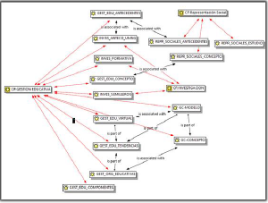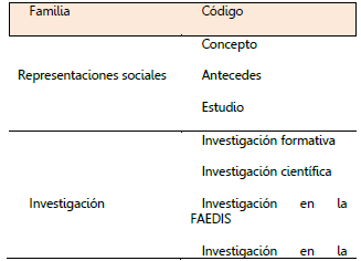 Nota: Una vez se organiza la información en categorías y subcategorías, se analizan para constituir patrones y de esta forma agruparlos en tres familias: gestión educativa, representación social e investigación. Luego se examinan los códigos y se establecen relaciones: es asociado con, es parte de.