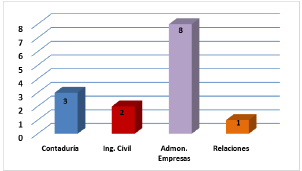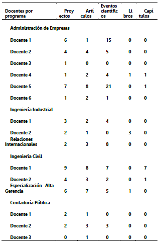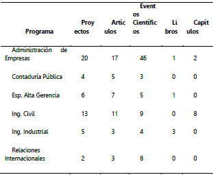 Los programas con más docentes investigadores son Administración de Empresas, con seis, y Contaduría Pública, con cuatro, como se aprecia en la siguiente tabla.