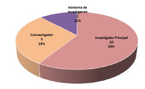 Dieciocho docentes investigadores, dos están desarrollando su doctorado, quince tienen maestría y dos se encuentran cursándola, un docente está clasificado como investigador junior hasta 2016. Los demás sin clasificar, encontrándose que el único docente clasificado ha desarrollado nueve proyectos en los ocho años de investigador; cinco docentes tienen trayectoria en proyectos de investigación superior a 8 años, (Tablas 3 y 4) y figura 3.