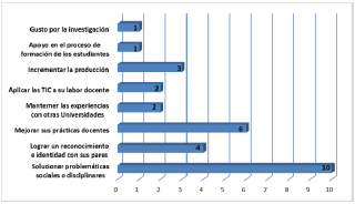En cuanto a la actitud de los docentes ante los procesos de investigación, manifestada en la respuesta a la pregunta qué factores lo motivan a investigar, se destacan mejorar su práctica docente y resolver problemáticas sociales o disciplinares, que en ocasiones se ven frustrados por la falta de tiempo asignado para estas labores, como lo señalan Sancho, Creus y Padilla (2011); se encuentran inconvenientes por ausencia de planeación para realizar tres labores rigurosas con la misma calidad como son la docencia, la investigación y la gestión, lo que no permite que un docente trabaje en lo que realmente prefiere y pueda aportar más a la excelencia de la IES.
