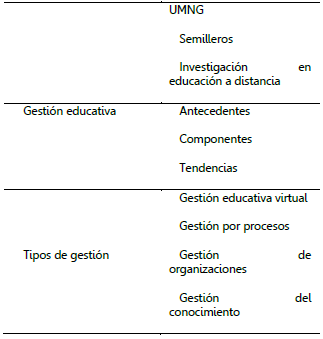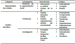 Se continuó con la codificación axial, que consiste en entrelazar las categorías con sus subcategorías y, de esta forma, tener más precisión, claridad y mayor análisis de los conceptos (Strauss y Corbin, 2004). En tal sentido, para los tres conceptos inicialmente planteados –gestión, representaciones sociales e investigación– se contemplaron antecedentes, conceptos, tendencias, entre otros, como se observa en la siguiente figura1 .