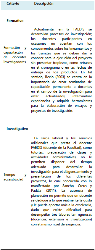 Se concluye que, aunque existe un compromiso desde la FAEDIS, el centro de investigación y los docentes investigadores para el desarrollo y fortalecimiento de los procesos de investigación, se requieren mejoras de infraestructura tecnológica y políticas institucionales relacionadas con los procedimientos y funciones frente a los procesos investigativos, como lo expresa García (2000), cuando menciona que existe separación entre las dependencias dedicadas a la investigación y las dependencias encargadas de la toma de decisiones.