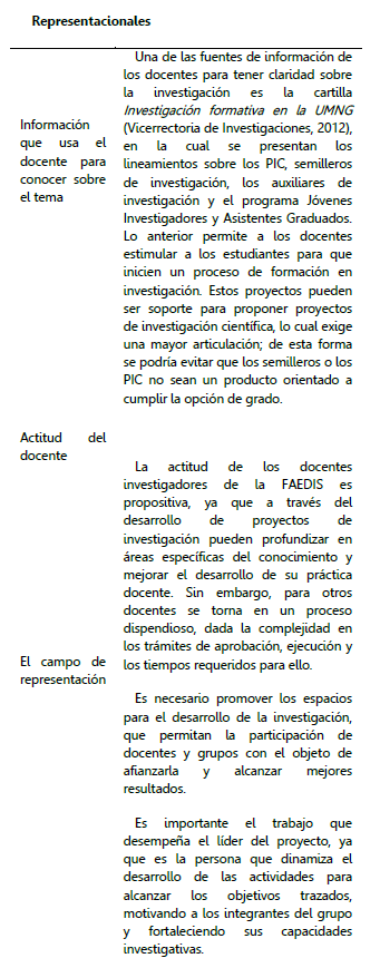 La FAEDIS desde la Decanatura y el EDISINV han procurado generar espacios que promuevan y proyecten la investigación. Sin embargo, se observa falta de capacitación de los docentes investigadores y complejidad en el trámite de los procesos administrativos que conllevan los proyectos, elementos que generan desmotivación en los docentes para presentarse a las convocatorias de investigación, evidenciada en el análisis de la técnica del cuestionario aplicado, al indagar por la asesoría solicitada para la presentación de proyectos; esta pregunta hace parte del componente de actitud de la representación social desde Abric (2001), quien señala que el desempeño de los individuos depende de las interacciones desarrolladas en las relaciones intergrupales, y de Mora (2002), que define que la función de la RS “Es la elaboración de los comportamientos y la comunicación entre los individuos” (p. 7).