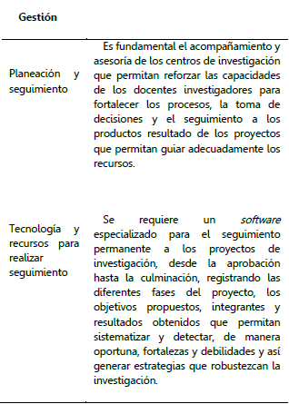 A partir de los resultados obtenidos de la aplicación del cuestionario y de la observación documental, se evidencia el reconocimiento de los productos de investigación de FAEDIS en la UMNG. Sin embargo, se encuentra que falta fortalecer algunos temas como son capacitación a docentes (de planta –medio tiempo, tiempo completo– y ocasionales) que participan en proyectos de investigación, políticas de participación en proyectos para los docentes, generación de metas desde la Vicerrectoría de Investigaciones que permitan mayor relevancia a los PIC y semilleros, así como a los proyectos de innovación, alto impacto, fase 0 y fase 1. Lo anterior, en concordancia con el planteamiento de Rodríguez, Cohen, Pedraja, Araneda y Rodríguez (2014), quienes consideran esencial la gestión del conocimiento para lograr niveles de calidad en la docencia, con mayor énfasis en las etapas de creación, comunicación y aplicación de conocimiento.