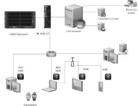 De igual forma, la virtualización de escritorios basada en la tecnología Citrix se ha unido al entorno educativo en donde Xu, Yang y Lei con un diseño de una plataforma para la educación primaria (Xu et al., 2015) resaltan el bajo consumo de energía, el despliegue rápido de software principal, la facilidad en la gestión unificada de asignación y utilización de recursos, el acceso flexible que permite a los estudiantes acceder a los materiales necesarios desde cualquier PC en el aula educativa y el ahorro considerable de recursos de almacenamiento. En este último punto coinciden con Manvar, Mishra y Sahoo al afirmar que el beneficio más importante es la conservación de los recursos, siendo la virtualización una ayuda en la consolidación y balanceo de carga (Manvar et al., 2012). Asimismo, tras dos años de la implementación de VDI en la Universidad de Economía en Wroclaw (Chrobak, 2014), se reitera la eficiencia que promete en cuanto al uso de los recursos y la oportunidad de acceder a software especializado desde cualquier dispositivo, en cualquier momento y desde cualquier lugar.