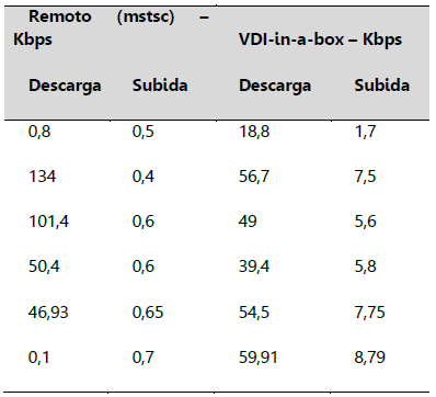 Utilización de red. En la recolección de datos con respecto a la carga de red, se vislumbra que la solución con Oracle, a través de RDP o RFB, no cuenta con protocolos optimizados para este tipo de implementaciones; estos protocolos son utilizados actualmente en eventos como las maratones de programación, en donde los estudiantes acceden a escritorios remotos a través de la utilización de VNC.