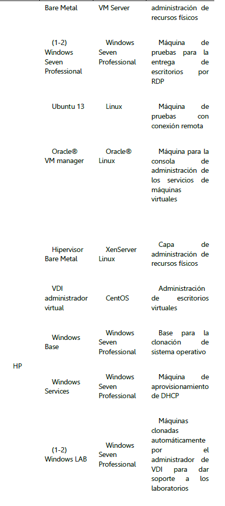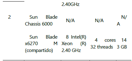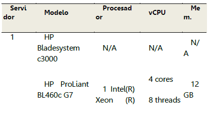 Para el desarrollo del proyecto y puesta en marcha de las pruebas piloto, el proyecto curricular de Ingeniería de Sistemas concedió el acceso y utilización de una parte de los servidores de cómputo que tiene a cargo la Facultad de Ingeniería y en los que se desarrollaron las pruebas de las herramientas de virtualización. La especificación técnica de estos servidores se puede visualizar en la tabla 1 y en el siguiente apartado.