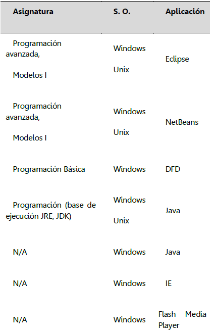 Una vez revisadas las aplicaciones de mayor utilización en los laboratorios de cómputo, se seleccionan las aplicaciones más representativas, además de algunas aplicaciones propias del sistema de utilización diaria para los usuarios con los que se realizó la prueba de concepto. Esta información se puede ver en la tabla 2.