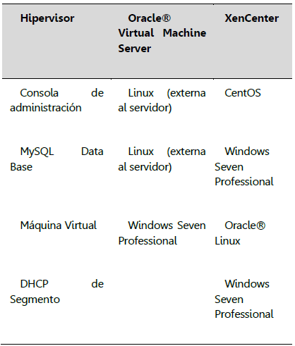 El primer ambiente se configuró en el hardware Oracle®, con escritorios administrados desde el software Oracle® Virtual Machine, que se ofrece a través del protocolo RDP nativo en Windows. En el segundo ambiente se configuró la solución de Citrix® con máquinas administradas con el software VDI-in-a-box; estos escritorios se distribuyen a través del protocolo ICA propiedad de Citrix Systems.