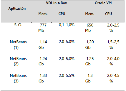 Desempeño de aplicaciones. Se evidencian falencias con la solución de Oracle VM respecto del manejo de los componentes gráficos y las respuestas visuales; se muestran imágenes pixeladas, tanto para fotogramas como para video, además de la dificultad en la administración de imágenes en alta resolución o en 3D, necesarias para materias relacionadas con el geoposicionamiento, las cuales generan cansancio visual y descontento en los usuarios finales.