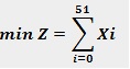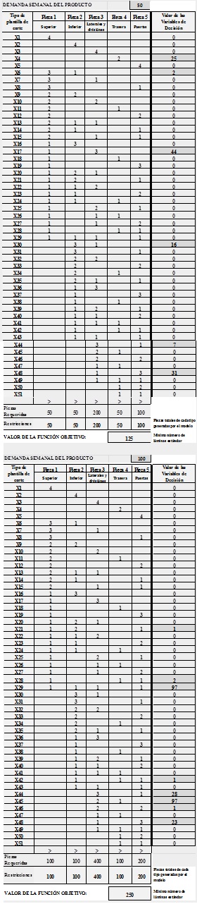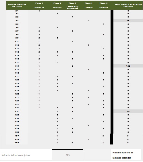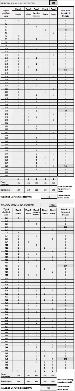 X1, X2, X3, …, X51: Corresponden a las 51 plantillas o patrones de corte por lámina estándar que le indicarán al operario la forma óptima de efectuar los cortes para obtener las piezas necesarias para satisfacer la demanda semanal del producto, utilizando la menor cantidad de ellas. El valor o resultado de cada variable debe ser un número entero por cada tipo de combinación, siendo cero su mínimo valor. Si el valor resultante es cero, indica que este patrón de corte no debe utilizarse.