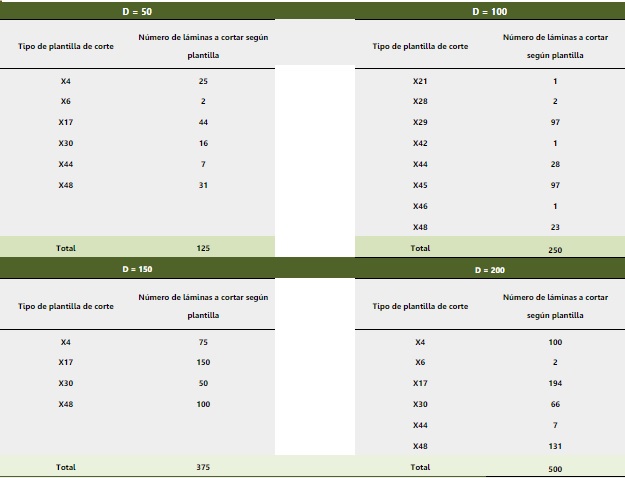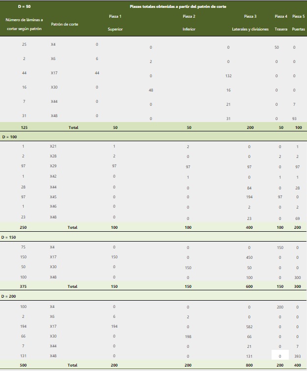 A manera de explicación, en la ejecución para una demanda de 150 unidades semanales (D = 150), el resultado indica que son necesarias 375 láminas estándar, de las cuales 75 deberán cortarse según el patrón X4 para obtener 150 piezas para la parte trasera; 150 láminas estándar se someterán al corte especificado por la plantilla X17 para obtener 150 piezas de la parte superior y 450 piezas laterales o divisiones internas; 50 láminas se cortarán bajo el formato X30 para conseguir 150 piezas de la parte inferior y 50 piezas laterales o divisiones y finalmente debe aplicarse el formato de plantilla X48 a 100 láminas estándar para obtener 100 piezas laterales o divisiones y 300 puertas.