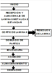El proceso general de fabricación del producto está integrado por siete pasos: Recepción y almacenamiento de láminas metálicas estándar, Corte de lámina y generación de residuos de lámina, Doblado de partes, Soldadura, Acabado, Almacenamiento y Despacho. La figura 1, muestra el diagrama general para la fabricación de un armario.