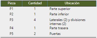Como ejemplo aclaratorio, la plantilla denominada X11 = 2P1 + P4, indica que, por cada lámina asignada a este patrón de corte, se obtienen dos piezas de la parte superior (P1) y una pieza de parte trasera (P4); de igual manera la plantilla identificada como X27 = P1 + P3 + 2P5, entrega una pieza para la parte superior (P1), una pieza lateral o división interna (P3) y dos piezas para puerta (P5), por cada lámina estándar cortada bajo este esquema de plantilla.