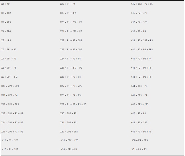 Combinando los moldes de cada pieza y el tamaño de la lámina estándar, se encontraron 51 posibilidades diferentes de plantillas de corte (Xi, i = 1,…, 51), que se describen en la tabla 2. El valor de Xi es un número entero, no negativo, que le indicará al operario el número de láminas estándar que deben cortarse para obtener el número de piezas (P) asociadas a esa plantilla, de acuerdo a las especificaciones de la tabla 1.