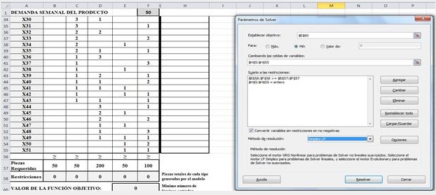 Una vez diligenciado este formato, se utiliza el complemento Solver de Excel para ingresar la posición de la celdas que contienen la demanda semanal de producto (F1), las ecuaciones de la función objetivo (E60), conjunto de restricciones