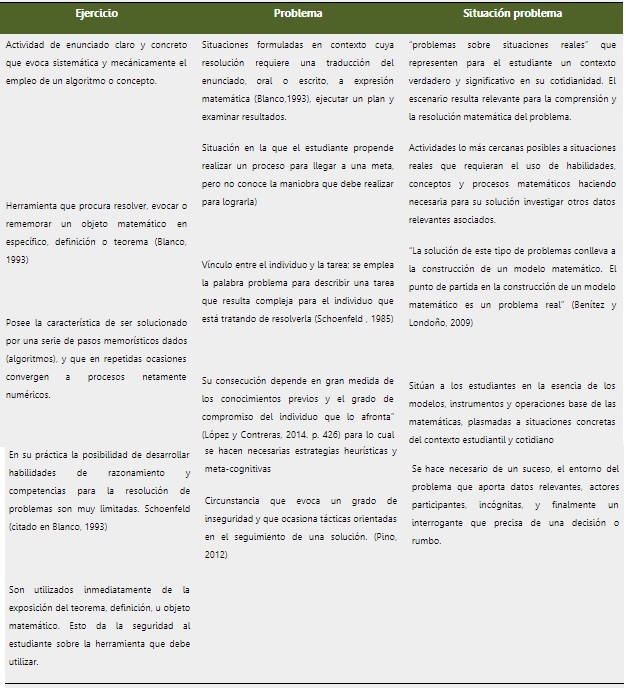 Las concepciones que poseen los profesores para la RP, la enseñanza y aprendizaje de las matemáticas, pueden estar ligadas a los mismos significados. Así mismo, estas concepciones pueden jugar un papel fundamental a la hora de cómo se tiene interiorizados los conceptos de ejercicio, problema en matemáticas, y situaciones problema. En síntesis, la matriz representa un paralelo entre lo que diferentes autores comprenden sobre “ejercicio”, “problema” y “situación problema”