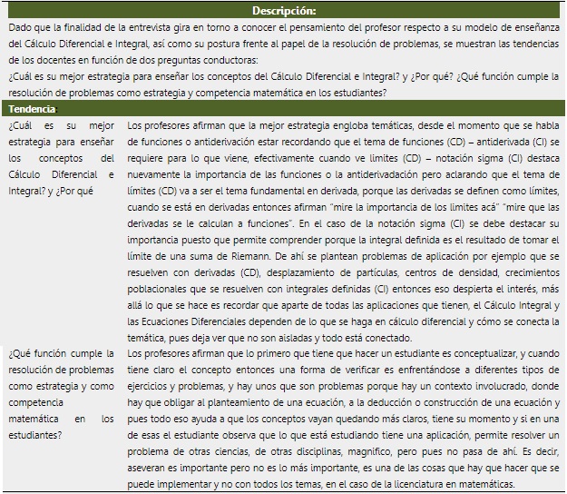 El procesamiento de la información recogida mediante el diario de campo permitió, establecer categorías de análisis que luego fueron trianguladas con otros instrumentos utilizados durante el trabajo de campo, con el propósito de desarrollar una comprensión sistemática para identificar los patrones que configuran las concepciones y el modelo de resolución de problemas adoptan en el aula de clase para determinar el conocimiento, la experiencia, las acciones, las metodologías, las técnicas, los recursos, el contrato didáctico, las variables didácticas, la transposición didáctica, y la interacción, para acercarnos a una trayectoria real sobre la enseñanza del Cálculo a través de la RP y dejar de alguna manera plasmado un modelo de RP aplicado a la enseñanza de conceptos en esta área del conocimiento.