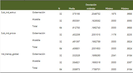 Grado de transparencia activa. Los valores estadísticos básicos obtenidos con la realización de la revisión de la información publicada en los sitios web de las 64 entidades públicas, distribuido en 32 alcaldías y 32 gobernaciones permite apreciar el promedio de los resultados del ITG muestra una puntuación por encima del 50%, logrando un grado de transparencia activa medio en cuanto a la información requerida, no siendo esto muy distintos entre las entidades, como se evidencia en la desviación estándar. (tabla 2).