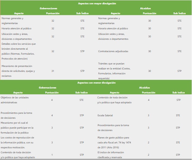 Para llegar a los anteriores resultados se diseñó un índice de transparencia global (ITG) que resulta de reconocer los requisitos mínimos exigidos en la Ley 1712 de 2014. Este índice se encuentra conformado por los subíndices de estructura (STE) y de procedimientos (STP) que consideran un total de 49 aspectos indagados en los sitios web de las administraciones públicas territoriales en Colombia, encontrando que los aspectos con menor nivel de publicación son los que se refieren a los procedimientos, los cuales al reflejar la relación directa entre las entidades y los ciudadanos en materia de servicios, toma de decisiones, quejas y reclamos, datos abiertos, entre otros, son de importancia para aumentar la confianza en las administraciones públicas y dar cumplimiento a lo establecido en la Ley.