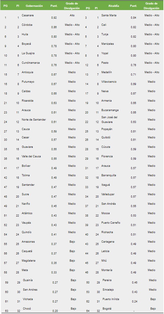 Finalmente, se concluye que las administraciones públicas territoriales deben realizar un esfuerzo para mejorar sus prácticas de publicación y acceso a la información, con el fin de lograr una cultura de divulgación de la información que represente un escenario de transparencia activa que contribuya a mejorar las relaciones entre estas y los ciudadanos y, a la vez, permita disminuir la discrecionalidad en las actuaciones de los gestores públicos que puedan conllevar a situaciones de corrupción.