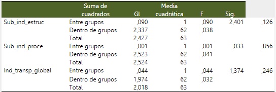 Para el contraste de esta hipótesis, se trabaja con poblaciones independientes. La hipótesis se asume como nula, buscando la existencia de diferencias estadísticamente significativas entre las gobernaciones y las alcaldías con respecto al ITG mediante el modelo de ANOVA (Alcaide, Rodríguez, & Garde, 2014), considerando que se cumplen los supuestos de normalidad y homogeneidad de las varianzas. El análisis estadístico correspondiente se realizó en SPSS Statistics 22.
