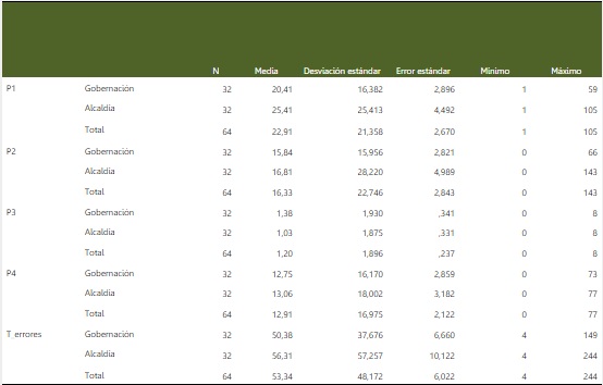 En promedio los sitios web de las gobernaciones presentan menores errores respecto a las alcaldías y sus resultados son más homogéneos, tal como se muestra en los valores totales (t_errores) de medias y desviación estándar. Asimismo, las páginas web con menor número de errores generados corresponde a alcaldías de Pereira (4), Popayán (5) y Bogotá (9) y las Gobernaciones de Antioquia (4) y Casanare (5). Igualmente, las páginas con mayor número de errores corresponde a alcaldías de Medellín (244) y Villavicencio (190) y la Gobernación de Norte de Santander (149). Llama la atención los casos de la gobernación de Antioquia y la alcaldía de Medellín en los que se esperaría los resultados fueran cercanos dado que al encontrarse en una misma zona geográfica las posibilidades de sinergias en esta materia podrían conllevar a una mejora en la accesibilidad en sus sitios web. Por otra parte, los errores que mayor presencia tienen en los sitios web son de tipo P1, es decir, que son aquellos que afectan la percepción de los usuarios a la hora de acceder a la información. Por el contrario, aquellos de tipo P3, es decir, que afectan la comprensibilidad al momento de acceder a la información son los que obtiene una nota media menor con respecto a los otros tipos de errores.