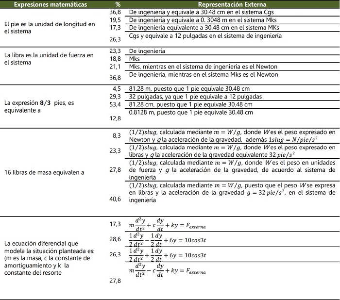 Las Tablas 1 y 2 muestran la diversidad de representaciones externas que hace cada participante a conceptos como libra, pie, unidades de fuerza, unidades de masa y la correspondiente ecuación diferencial que modela la situación planteada, a partir de los ítems con respuesta cerrada.