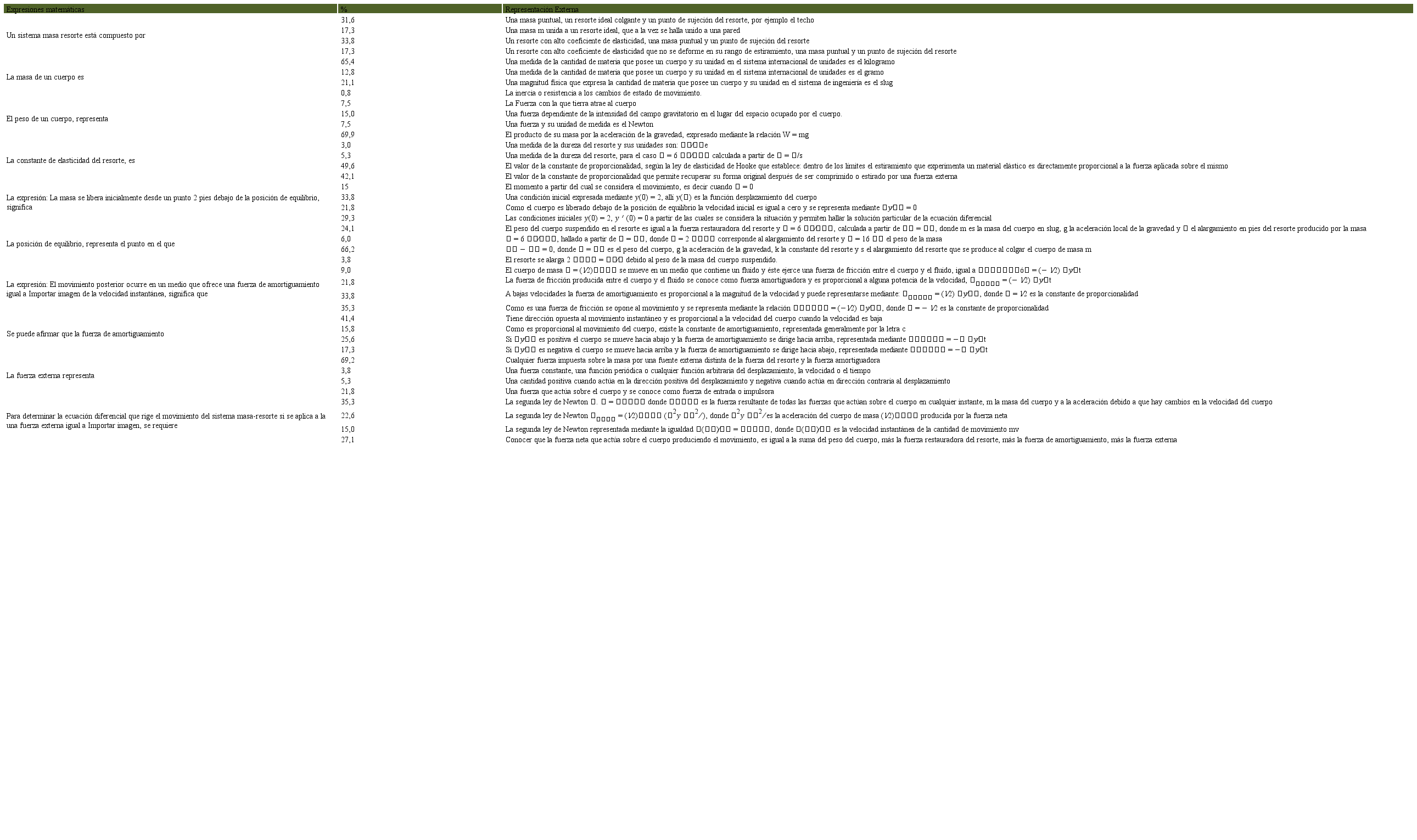 En la Tabla 2 se observan también las diferentes formas de interpretar expresiones como: punto de equilibrio, fuerza amortiguadora, constante de elasticidad, proporcionalidad, velocidad como razón de cambio entre otros. Conceptos que tienen que ser evocados por el estudiante, ya que debieron ser abordados en los curos precedentes.
