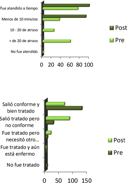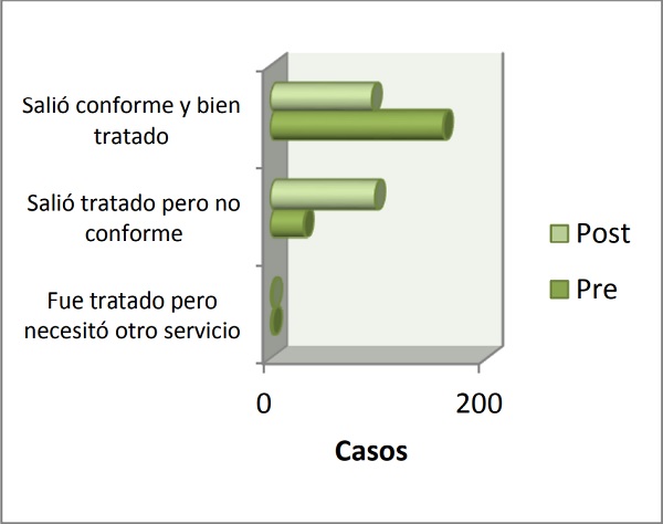 Para el capítulo de Satisfacción del usuario, la oportunidad para la consulta médica mejoró , el trato en el servicio de urgencias, hospitalización y laboratorio clínico desmejoró, la oportunidad en el laboratorio clínico y el trato en la entrega de medicamentos mejoró durante la intervención, esta mejora en la satisfacción ha sido encontrado en estudios previos de Freeman y Miller (Blumenthal, Emery y Madden, 1991).