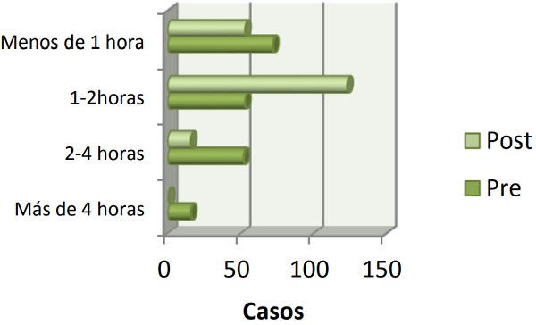 De otra parte, aumentó el número de usuarios que asistieron a cine o conferencias de una manera estadísticamente significativa y disminuyó el número de usuarios que consumen alcohol post intervención y es estadísticamente significativo (p=0.001). Así mismo, los usuarios que acostumbran trabajar tiempo extra aumentaron después de la intervención.