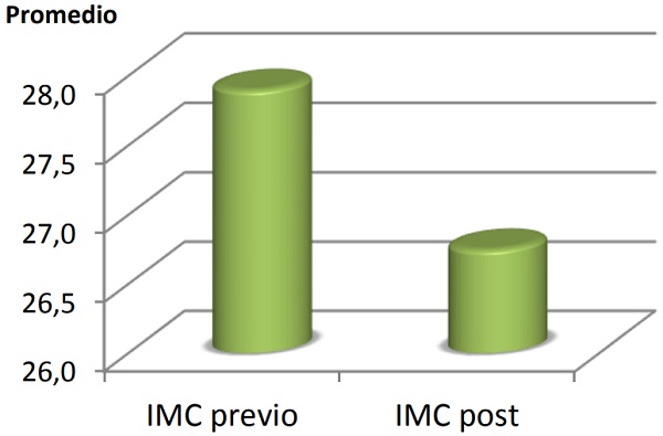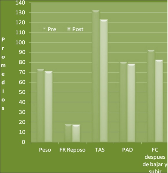 La media del peso al iniciar la intervención con respecto al final se redujo en 2.47 Kg. y es estadísticamente significativo. La media general del Índice de masa corporal (IMC), se redujo postintervención en 1.1503 y es estadísticamente significativo. La media de la frecuencia en reposo aumentó en 0.59 respiraciones por minuto y fue estadísticamente significativo.