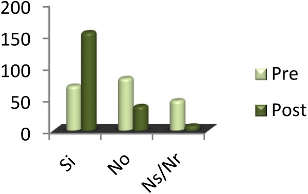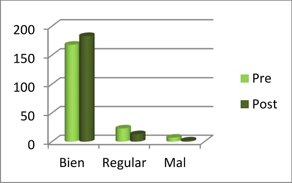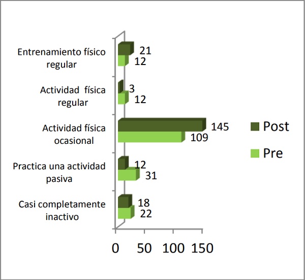 Referente al cuestionamiento ¿cada cuánto practica algún deporte? se codificaron las variables en 3 categorías: Una primera considerada buena donde se ubicaban las respuestas de “diariamente” y “más de tres veces por semana”, una considerada regular, donde se situaban las respuestas de: “Una vez por semana” y “quincenal” y una mala donde se incluía la respuesta “ocasionalmente”. El resultado confirma que la frecuencia en que los usuarios practicaban algún deporte aumentó postintervención y es estadísticamente significativo a un 95% de confiabilidad.