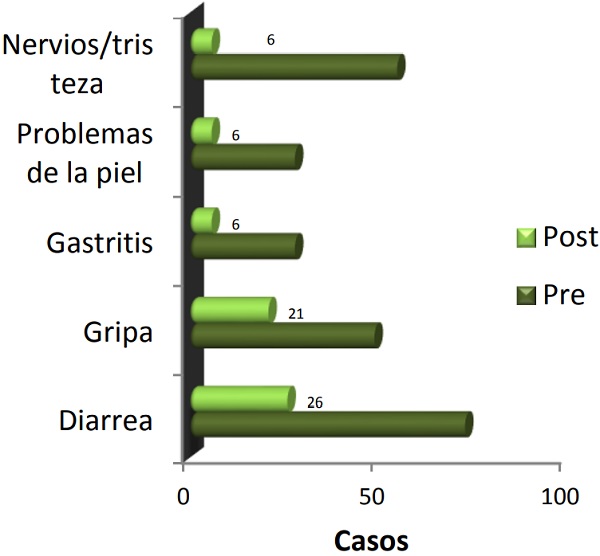 Antes de la intervención afirmaban haber padecido diarrea 10.05% y después 5.02%, no es estadísticamente significativo, frente a haber padecido gripe 36.68% antes y después 13.06% y es estadísticamente significativo. Antes de la intervención sufrieron trauma un 10.55% y un 6.53% después pero no es estadísticamente significativo. De Intoxicación, antes de la intervención sufrieron intoxicación un 1.50% y un 1.00% después, pero no es estadísticamente significativo. Antes de la intervención sufrieron gastritis un 24.62% y un 10.55% después y es estadísticamente significativo, sufrieron problemas de la piel el 14.07% y después un 3.01% y es estadísticamente significativo. Antes de la intervención sufrieron de nervios y tristeza el 16.58% y después un 3.01% y es estadísticamente significativo. De ellos, afirman haber sido atendido por médico un 44.22% antes de la intervención y un 22.11 % después y esto es estadísticamente significativo.