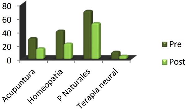 Con respecto al uso de medicación no tradicional los resultados fueron todos a la reducción, así: Acupuntura, pasó de 15.38% a 7.69% pos intervención, homeopatía de 20.61% a 11.34%, uso de productos naturales de 35.20% a 26.53%.