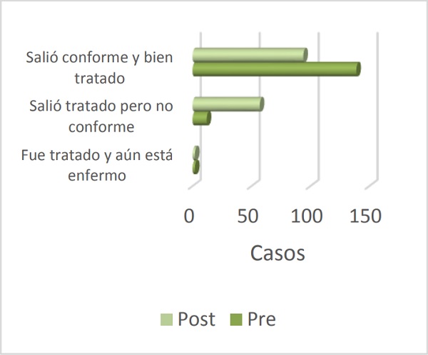 En referencia al funcionario que atendió el padecimiento, se encuentra un dato interesante al observar que la atención por los médicos se redujo a la mitad comparando el antes y el después de la intervención, lo que indica una participación mayor de otras disciplinas de la salud en la resolución de los padecimientos y un nivel de juicio crítico del usuario que lo lleva a empoderarse de sus propias soluciones. Quienes recurrieron a los profesionales médicos afirman haber reducido el tiempo de espera y el gasto de bolsillo. Referente a la adquisición de medicamentos se redujo en un 50%, lo cual demuestra resultados sociales importantes, específicamente en equidad.