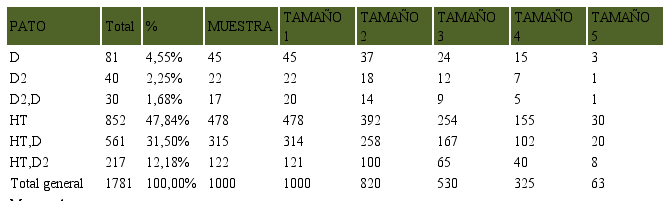 Población en estudio y selección de la muestra: Tratando de abarcar uno de los aspectos más influyentes en el sistema de salud de la Policía Nacional, se decidió evaluar una población de crónicos en Bogotá seleccionando aquel grupo que consumía medicamentos para hipertensión, dislipidemia, diabetes y sus combinaciones, para ello se tomó la base de datos del contrato de medicamentos definiendo 17810 eventuales usuarios consumidores en los últimos 3 meses (febrero, marzo, abril de 2004), de ellos se realizó la selección de 1000 por afijación proporcional (tabla 1)