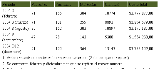 En el caso del análisis sobre uso de medicamentos, se entregaron los nombres y documentos de identidad de los 199 usuarios objeto del análisis a el técnico en sistemas autorizado, los cuales fueron cruzados con las bases generales de registro de medicamentos, coincidiendo en el mayor número (91), en los meses de febrero y diciembre de 2004, seguidamente se selecciona el vademécum que fue comparado, advirtiendo que solo se incluyeron los medicamentos para la hipertensión arterial, diabetes y dislipidemias, a estos se revisa y unifica por códigos ,se les valora a los precios facturados por el contratista en diciembre de 2004, se comparó el costo por usuario y el número de moléculas prescrito por usuario.