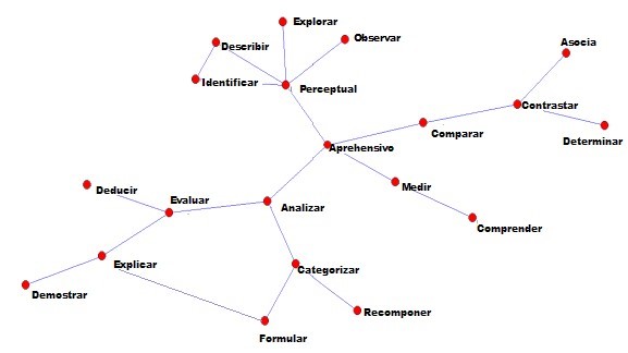 Teniendo en cuenta técnicas de análisis de contenido, y especialmente, técnicas de análisis estadístico, de redes y de visualización de información, a partir de un proceso holístico, que incluye comportamientos y está integrado complementado con los modelos pedagógicos y sus estrategias, con el objetivo de identificar tendencias e interrelaciones entre los términos utilizados en ellas y sus autores (Figura 1). Se observa el alcance las competencias desde un nivel perceptual en el cual el estudiante observa, explora, identifica, describe e identifica conceptos, sigue su proceso de desarrollo del pensamiento hacia un estadio de aprehensión caracterizado por medir, comparar, contrastar, determinar y asociar a otros conceptos; que le llevan a un estadio de análisis de conocimientos, habilidades y actitudes, donde el estudiante categoriza, recompone variables, formula proyectos o modelos y a partir de ello puede en un último estadio evaluar y para ello deduce, explica, y demuestra.