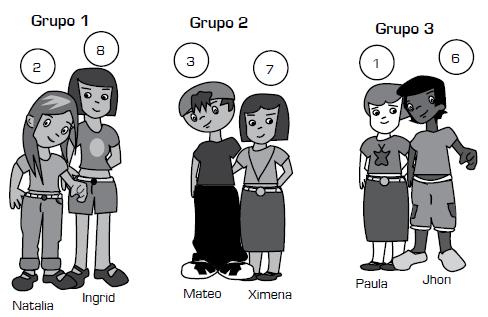 6. En un juego, cada jugador toma una ficha con un número y busca un compañero con otra ficha. Si los números suman 10, el grupo gana. Estos son los grupos que se formaron con sus respectivas fichas.