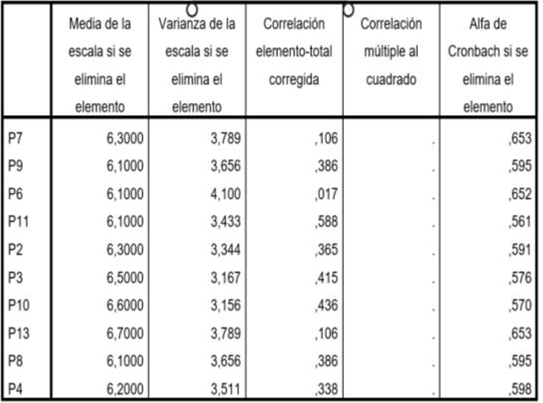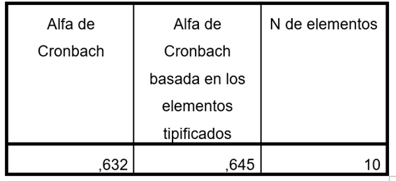 El coeficiente alfa de Cronbach total del instrumento que fue 0.632 ligeramente inferior al mínimo aceptable de 0.7 considerado en este artículo. El número de elementos corresponde al número de preguntas consideradas en el instrumento.