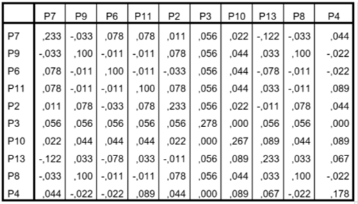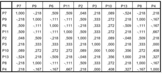 La matriz de correlación (tabla 2) es una matriz cuadrada que indica la relación de cada pregunta con las demás, y en sí misma en la diagonal. Muestra el coeficiente de correlación de Pearson (r) como: “medida de la fuerza de la relación lineal entre dos variables, varia de -1 a 1, cercana a 0 indica poca asociación, cercano a 1 indica una asociación directa y cercana a -1 indica una asociación inversa, entre las variables.” (Lind et al., 2008a).