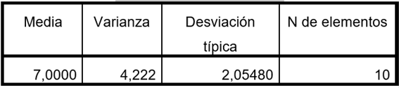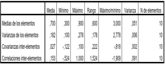 La tabla 4 muestra un resumen de los estadísticos arrojados por el software, el primer renglón medias de los elementos muestra el promedio de todas las medias de todas las preguntas y arroja un valor de, 700, la media menor es, 300, el promedio mayor es, 900; su rango, diferencia entre el valor mayor y menor es de, 600, la razón por división entre estos 2 valores es de 3,000 y su varianza de ,051.