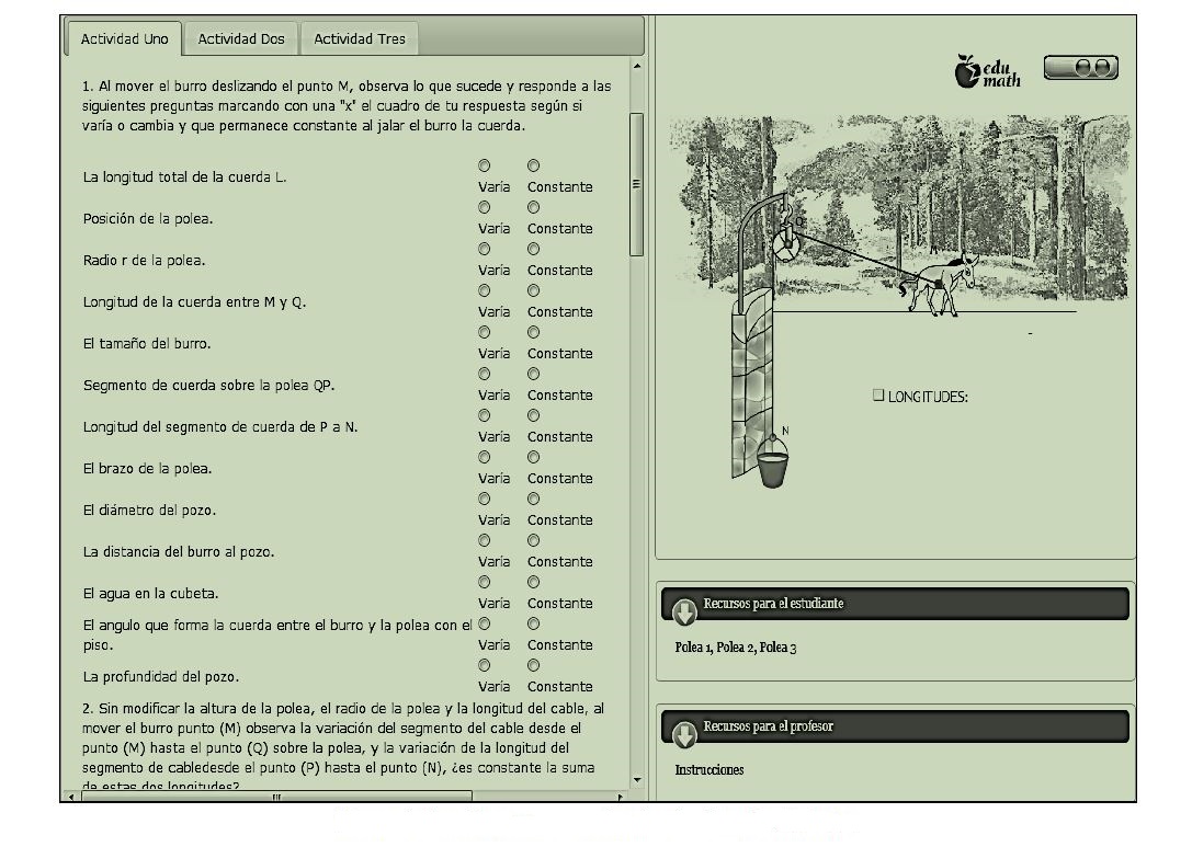 Para introducir el concepto de función el EDID “Polea 1 o introductoria” pretende desarrollar el pensamiento funcional mediante el manejo de una polea simple, y a la vez que el alumno delimite los conceptos de: variación, variable, variable independiente, variable dependiente y parámetro. Una representación de la polea jalada por un burro en un extremo y una cubeta con agua en el otro extremo. Se solicitó al estudiante mover el burro deslizándolo y observar qué sucede. Antes de mover el burro, el estudiante puede modificar: altura de la polea, radio de la polea, y longitud de la cuerda (Figura 1). La primer consulta al estudiante, en el cuestionario, fue sobre variación. Luego se le solicita dejar fijos los valores de altura, radio de la polea y longitud del cable, y se pregunta sobre el valor que cambia en los respectivos segmentos de la cuerda y su relación con la longitud total de la cuerda, a diversos movimientos del burro. Se refuerza al solicitar que observen lo que está fijo y lo que varía, y al cambiar los valores del radio de la polea y la longitud de la cuerda para lograr que el estudiante identifique los conceptos a estudiar: constante, variable independiente, variable dependiente, parámetro, dominio, rango y variación. Para que el estudiante desarrolle las actividades se tienen los RRS: real, gráfico, aritmético y algebraico, que corresponden al Pensamiento aritmético, Pensamiento aritmético avanzado y una aproximación al Pensamiento algebraico.