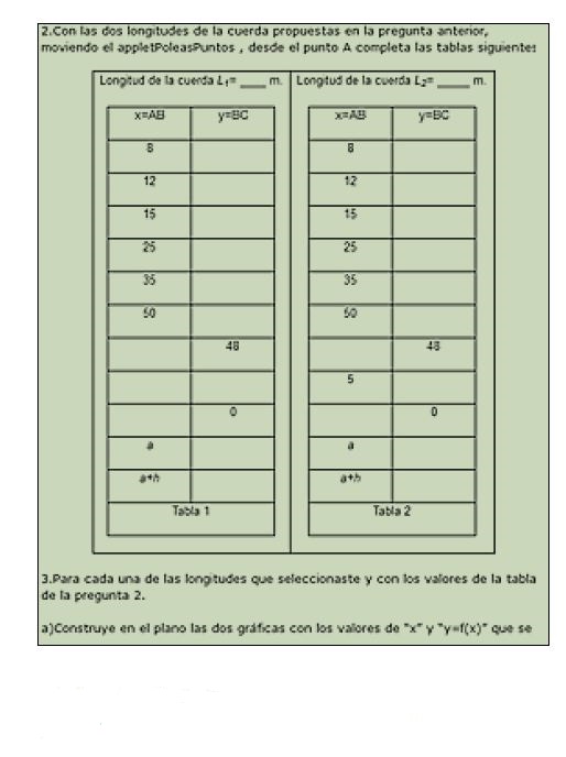 En los cuestionarios, se solicitó al estudiante fijar un valor de la cuerda L, y se le cuestionó sobre los posibles valores que puede tomar (valor menor y valor mayor) que permitan llegar a establecer el concepto de dominio, elemento esencial para llegar al de función; en todo momento se asocia la variación. Se introdujo el manejo de tablas de valores y por lo tanto de relación entre pares ordenados, lo que llevará a conformar una gráfica, para finalmente llegar a la expresión que describe el comportamiento de la cuerda en la polea. Para concluir, se buscó que el alumno delimitara los conceptos de variable, variable independiente, variable dependiente, parámetro, ecuación y función.
