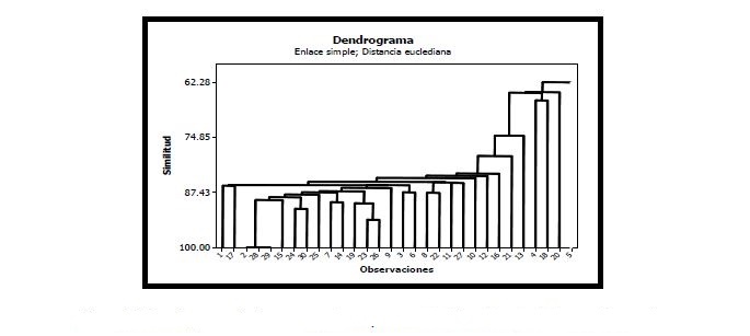 Hay que resaltar que para la generación de los grupos, al software se le especificó la creación de dos grupos sin definir los miembros de cada uno. La figura 2 muestra el dendrograma con las agrupaciones correspondientes. El resultado obtenido coincidió con el obtenido con el método de clasificación. Al apoyar la formación de dichos conglomerados se encontró que el nivel de similaridad del primer grupo fuede 79.6% y el del segundo grupo fue de 71.9%.