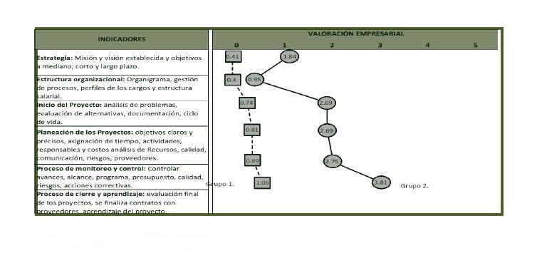En primera instancia se observa que el grupo 1 se encuentra en un nivel de gestión de proyectos menor que el grupo 2. Con un promedio de calificación de 0.70, el grupo 1 se encuentra en un bajo nivel de desarrollo en la gerencia de proyectos, en el cual no todos los procesos necesarios se desarrollan y los que se desarrollan no son estandarizados para todo el personal. En estas empresas las operaciones se realizan de acuerdo con la función que cada quien desarrolla.