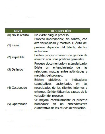 Se observa cómo la organización se apega a procesos comunes y repetibles para realizar el trabajo, valorando su capacidad según una escala que indique la medida de las habilidades de la empresa para la gestión (Mutafelija & Stromberg, 2003), (Aguirre & Córdoba, 2008). Las propuestas metodológicas consideradas incluyen diferentes escalas, pero para el presente proyecto se construyó una escala específica.